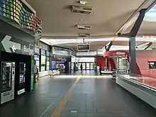 Running along the 38-metre (125 ft) long station concourse wall is a piece of public art titled Rain on Water, by Geoffrey Drake-Brockman. The artwork consists of 1,200 aluminium rods with various lengths. Each rod has a brightly coloured end, with the colour depending on the height of the aluminium rod; shorter rods being on the blue end of the spectrum, and longer rods being on the red end of the spectrum. The artwork represents the ripples from raindrops falling on water, with mathematical modelling used to determine the height of each rod to make the piece of art look like a realistic wave.[10][11]