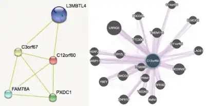 Several other proteins might also interact with C12orf60,[27] and some are predicted to be co-expressed with the protein.[28] Possible protein interactions include L3MBTL4, C3orf67, FAM78A, and PXDC1. Rats that overexpressed L3MBTL4 had higher blood pressure and heart rate.[29]