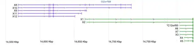 C12rf60 is located on Chromosome 12 beginning at 14,803,572 bp and ending at 14,823,858 bp, spanning 20,287 base pairs[10] It is located on the forward/positive strand between the 12p12.3 and 12p13.1 cytogenic bands.[11] Other genes that are within 100 kilobases of this gene include:[12]