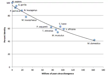 The percent identity of several sequences to the human C16orf95 protein were graphed with respect to approximate time of divergence. Data points are labeled with the appropriate species name. Median dates of divergence were found using TimeTree.[4]