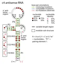 Bioinformatics analysis uncovered many homologs of the c4 antisense RNA that conserve the secondary structure originally proposed for it.[1] These homologs are present in purified phage particles of other phages, as well as bacterial genomes. The presence of c4 antisense RNAs in bacteria is to be expected, since the P1 and P7 phages are temperate and can stably integrate into the host genome. The c4 antisense RNA consists of a three-stem junction. The terminus of the stem designated as "P2" very often conforms to highly stable tetraloop motifs that were previously elucidated, conforming to the consensus GNRA, UNCG or CUNG, where R represents either A or G nucleotides, and N can be any nucleotide.[1] A rho-independent transcription terminator is often found that overlaps the c4 antisense RNA structure.[1] Although RNAs often overlap transcription terminators to regulate transcription abundance, the information known about c4 antisense RNAs suggest that their terminator is more likely to be constitutive. Later bioinformatics work uncovered an additional set of RNAs called ("c4-2" RNAs) that appear to function as c4 antisense RNAs, but have a somewhat altered secondary structure.[3]