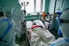 ![]() A COVID-19 patient in a severe state in Chernivtsi in May 2020 | |