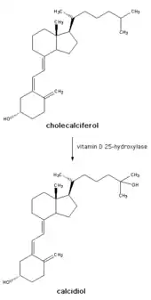 The conversion of vitamin D, especially cholecalciferol, to 25(OH)D (calcifediol) is one of the key steps in the vitamin D hormonal system. The CYP2R1 enzymatic activity achieving this process was previously thought to be constitutively expressed and stable, so that serum 25(OH)D was a measure of the supply of vitamin D.[9]