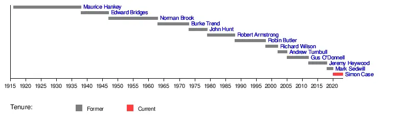 Simon CaseMark SedwillJeremy HeywoodGus O'DonnellAndrew Turnbull, Baron TurnbullRichard Wilson, Baron Wilson of DintonRobin ButlerRobert Armstrong, Baron Armstrong of IlminsterJohn Hunt, Baron Hunt of TanworthBurke TrendNorman BrookEdward Bridges, 1st Baron BridgesMaurice Hankey