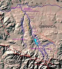 The Cacín River forms in what is now the Los Bermejales Reservoir, where several streams from the Sierras of Tejeda, Almijara and Alhama Natural Park converge. It flows north through a narrow canyon known as the Tajos de los Bermejales, where it has drops of 100 metres (330 ft). The Cacín river irrigates the lands of the west of the Vega de Granada comarca.[5] It joins the Genil to the southwest of Villanueva Mesía.