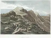 In his Dictionarum Duplex published in 1632, John Davies of Mallwyd differentiated between the two words cadair ('chair') and cader ('fort, fortress'), referring to 'Cader Idris' and 'Cader Ddinmael'. That interpretation was followed by some later lexicographers, including Thomas Charles[9] and Titus Lewis.[10] It is now accepted, however, that cader is a spelling of a spoken form of cadair, and that there is no evidence that cadair and cader are separate words.[11] But as it represents the pronunciation in the local dialect, the spelling Cader Idris is often seen in Welsh and English, and in June 2016 Snowdonia National Park decided to adopt that spelling on its signage, despite advice from the Welsh Language Commissioner and from Park officers, who favoured 'Cadair'.[12] The local dialect form is also seen in the name of the local secondary school, Ysgol y Gader. The name of the mountain is typically spelt Cadair Idris on current maps. The summit of the mountain is known as Penygader ("top of the chair/stronghold").
