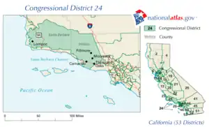 California's 24th congressional district is a congressional district in the U.S. state of California. The district is currently represented by Salud Carbajal. It contains all of Santa Barbara County, most of San Luis Obispo County, and part of Ventura County. Cities in the district include Santa Barbara, Ventura, San Luis Obispo, Santa Maria, and Ojai.[3]