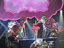 The show begins with a video screen introduction directed by Cole Walliser which tells the story of a girl named Katy who lives in a colorless world wasting her life cutting meat for a mean old butcher. One night, Perry escapes her dreadful reality by falling asleep and visits a vibrant candy land in search of her pet cat, Kitty Purry, and also for her love interest, the Baker's Boy, played by Nick Zano.[21] Katy appears on stage and starts performing "Teenage Dream" with her dancers, while wearing a white dress with spinning peppermints.[22] "Hummingbird Heartbeat" and "Waking Up in Vegas" are performed next, the latter accompanied by a human slot machine, showgirls and an Elvis Presley impersonator.[23] She leaves the stage briefly for a costume change while a video interlude shows Perry taking a shortcut that leads her into a candy forest where she meets two naughty mimes who join her on stage to perform "Ur So Gay". At the end of the performance, Perry takes a bite of their magical brownie.[21] Perry then makes a wardrobe change on stage, trading her skirt for a feathered tail while she begins to perform "Peacock", an elaborated feathered fan dance number.[21] After that, she is covered by peacock tails held by her dancers, and makes a costume change on stage by removing her peacock tail and wears a colorful vampy torch-singer garb over her blue suit. Perry interacts with the audience and invites a male fan on stage to flirt and kiss,[24] and then goes on to perform a slow version of "I Kissed a Girl" which shorty transforms into a rock version. Perry then exits the stage for a costume change while two female dancers keep dancing on stage until the song ends.