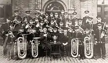 The Senior Band had a high reputation, and in 1932 were described as the finest in the south of England.[1][2] In 1929 Jim Thompson joined the band; later in 1939 he was to found the Belvedere Male Voice Choir.[4] In 1932 the band consisted of all brass instruments, plus four saxophones. At the time they were the only brass band with saxophones. The five soloists in that year were E. Farrington and R.W. Hardy on cornet, W. Sloane on euphonium, Harold Laycock on trombone and Pat Greener on xylophone. Laycock was later principal trombone, and only ever recorded six solos.[5] Some bandmasters such as the ex-military Tom Morgan in the 1920s could be terrifying during rehearsals, making them sweat with fear.[6][7]