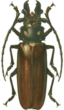 The beetle is a relict and the sole representative of the tropical genus Callipogon in the fauna of the Old World – other species of this genus inhabit Central and South America.[9] The divergence between Callipogon relictus and other species in the genus is estimated to have occurred around 34 million years ago, around the Eocene/Oligocene boundary, during the Early Eocene Climatic Optimum.[10] Callipogon relictus was described in 1898 by the Russian entomologist Andrey Semyonov-Tyan-Shansky (who wrote his last name as Semyonov until 1906). He distinguished the new species from the other species of the genus by the following features:[1][9]