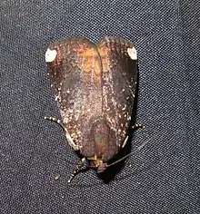 The adult is typically brown. Some adults possess a white spot near the wingtip of each forewing. Underside fawn colored. Some adults have a big yellow patch under each forewing by the base.[4] Larval host plants include Cordia macleodii, Cordia myxa.[5]