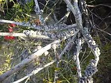 | Calothamnus quadrifidus homalophyllus growing near the Red Bluff car park, Kalbarri | |