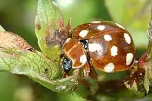 Calvia quatuordecimguttata, the cream-spot ladybird, is a species of ladybird in the family Coccinellidae. Its distribution is holarctic, it being found in Europe and through the East Palearctic to Japan. It is introduced to North America. This ladybird is generally 4 to 5 millimetres (0.16 to 0.20 in) in length and varies in appearance depending on the geographical location. It usually lives in hedgerows and deciduous trees.