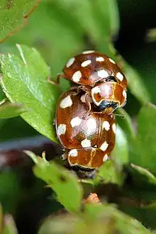 - ↑ Trevor and Dilys Pendleton (2004). "18-spot Ladybird Myrrha octodecimguttata". Eakringbirds.com. Retrieved 15 January 2013.