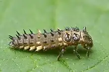 The larvae are black with white markings, have six legs and several blunt conical spines on each segment of the abdomen, similar to larvae of Cycloneda but with shorter legs.[1]