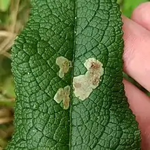 Calycomyza flavinotum is a species of leaf miner fly (family Agromyzidae).[1][2][3] It creates whitish blotch-shaped mines on the leaves of Ageratina altissima, Arctium minus (lesser burdock), Eupatorium spp., Eutrochium maculatum (spotted Joe Pye weed), and Eutrochium purpureum (purple Joe Pye weed), all flowering plants in the sunflower family.[3][4]