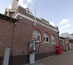 The postal hall breakfront wing is in exposed face brick with three stilted arched windows. These are divided into two plain-paned hinged casements in the lower parts and fixed multi-pane lunettes in the upper. The postal hall wing has a flat roof concealed behind a parapet. The original door that accessed this balcony has been replaced by a new panel door. A rendered string-course bearing the building's name extends across the street-facing elevation. Above that is a parapet in the same face brick with a cement render capping rising and falling over three raised bays. The current Australia Post retail logo has been applied to the centre of these parapet bays. Timber-framed public phone booths were probably added to the left front in the early twentieth century, and were later replaced with standard PMG aluminium-clad type.[3] A telephone booth and post box are in now front of the breakfront.[1]
