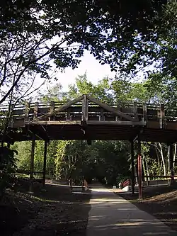 The Camelback Bridge is a restored historic wooden bridge that arches over the Constitution Trail in Normal, Illinois. It is on the U.S. National Register of Historic Places. The bridge's main span is a wooden kingpost pony truss. The bridge is supported by Phoenix columns, a type of wrought iron column that was patented by the Phoenix Iron Company in 1862. It is one of only two bridges in Illinois using the columns.[2]