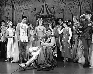 Camelot opened on Broadway at the Majestic Theatre on December 3, 1960, and closed on January 5, 1963, after 873 performances and 2 previews.[24] Directed by Moss Hart, the choreography was by Hanya Holm, scenic design by Oliver Smith, costume design by Adrian (who worked on the designs prior to his death in September 1959) and Tony Duquette, and lighting design by Abe Feder. It won four Tony Awards. The original cast album was America's top-selling mono LP record for 6 weeks.[25]
