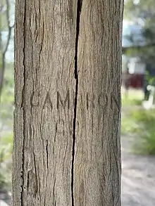 Cameron's 1 Ton Survey Post is a timber post 2.7 metres (8 ft 10 in) high and roughly square in section and is shaped into a pyramid at the top. It is carved with "J. CAMERON GS" running across on one face and "LAT 29 " on another.[1]