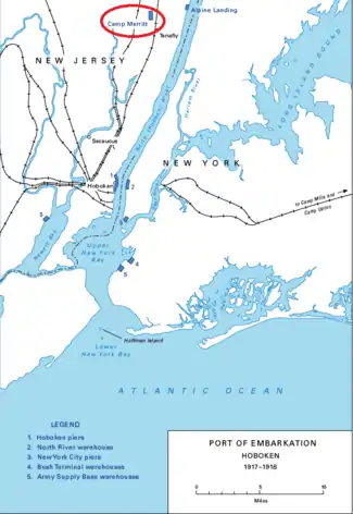 Camp Merritt was a military base in Dumont and Cresskill, in Bergen County, New Jersey, United States, that was activated for use in World War I. It had a capacity for 38,000 transient troops and was one of three camps directly under the control of the New York Port of Embarkation.[1] Two routes were used to transport troops, the first being local railroads which would carry the men South. The alternate route involved marching in contingents of two to three thousand men to the North-East and descending the Palisades. These men marched for an hour to board ferryboats at Old Closter Dock, Alpine Landing that took them to the piers at Hoboken, New Jersey to board troop transports for Europe.[2] Contingents would leave the camp for the landing at half hour intervals to board the ferries for the two hour trip to the embarkation piers where several transports might be loading simultaneously. There they would be joined by troops from Camp Mills and Camp Upton arriving by train at a terminal on Long Island for final transport by ferry to the embarkation piers.[1][3][4] Approximately four million troops were sent to the Western Front during World War I, about one million of them passed through Camp Merritt. Camp Merritt was decommissioned in 1919.[5]