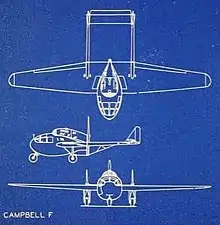 The Campbell Model F, a pusher configuration, two seat sport aircraft built in the 1930s, was unconventional in its day with its empennage on twin, slim booms, a cockpit under stepless, rounded, multi-panel glazing and a tricycle undercarriage.