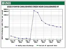 The United States Geological Survey (USGS) maintains two stream gauges along Canajoharie Creek. The upper one, in operation since 1993, is located 10 feet (3.0 m) upstream from the bridge on Mc Ewan Road, and 2.3 miles (3.7 km) southwest of the village of Canajoharie.[25] The lower one is located at the creek's mouth.[26]