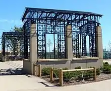 At its entrance are two 40-foot Corinthian columns salvaged from Chicago’s 1905 Federal Building. The columns are on axis with the classical columns of the Field Museum of Natural History located at the far south end of Grant Park.[3] Architect Henry Ives Cobb designed the columns. Before being placed in the Cancer Survivors Garden, the columns were submerged near the Lake Michigan shoreline in 1983 to help reinforce a breakwater.[1] The Chicago Architecture Foundation donated the columns to be placed next to the garden’s main pavilion.