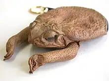 In Australian states where the cane toad is common, some "sports" have developed, such as cane-toad golf and cane-toad cricket, where cane toads are used as balls. In April 2005, Dave Tollner, a Northern Territory Member of Parliament, called for legalisation of attacks on cane toads. This was criticised by many animal and conservation groups, who claim freezing is a more humane way to kill cane toads than hitting them with cricket bats.[55] Townsville holds an annual "Toad Day Out", where the community learn about and catch cane toads, with prizes for the largest toad caught, and the heaviest weight of toads caught. In 2015, 143.6 kg (317 lb) of toads were caught.[56] In 2016, a drier year, 92 kg (203 lb) of toads were caught.[57] Cane toad races are popular in some towns and pubs. Toads are given humorous names and punters can bid or buy a toad or bet on them as in horse racing. Entrants or the winners commonly have to kiss their toads.[58][59]