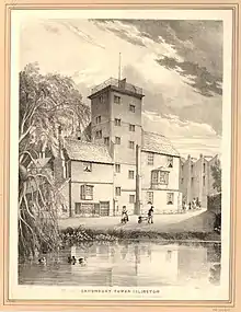 The layout of Spencer's Canonbury House seems to have been east, south and west ranges surrounding a courtyard, with the Tower at the north-west corner, and stables nearby.[9][Note 2] Contemporary engravings show a bell turret with a cupola stood above the east range, known as Turret House.[1] Canonbury House's walled grounds included gardens below the south range.[18] The southern corners of the gardens were marked by the two Tudor octagonal garden or summer houses which still stand today. On the north side were gardens which at an unknown later date contained a large fish pond.[19] The House and gardens stood in open agricultural and dairy fields with views towards London.[20]