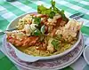 Compared to other Chinese regional cuisines, the flavours of most traditional Cantonese dishes should be well-balanced and not greasy. Apart from that, spices should be used in modest amounts to avoid overwhelming the flavours of the primary ingredients, and these ingredients in turn should be at the peak of their freshness and quality.[4] There is no widespread use of fresh herbs in Cantonese cooking, in contrast with their liberal use in other cuisines such as Sichuanese, Vietnamese, Lao, Thai and European. Garlic chives and coriander leaves are notable exceptions, although the former are often used as a vegetable and the latter are usually used as mere garnish in most dishes.