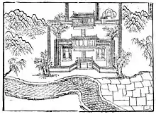 The Cao'e Temple (Chinese: 曹娥庙) was built to honor Cao E, a young girl who was drowned when she tried to save her father in an act of filial piety. The temple was built for the first time in the year 151, and has been relocated, rebuild, restored and expanded several times. The last time this temple was rebuilt was in 1929 after a huge fire, the restoration lasted until 1936.[1][2]