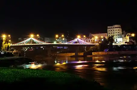 The Peninsular valley of Cao Bằng province is formed between the Bằng Giang and Hien rivers. The two rivers confluence to the northwest of the town. In the war with China the town was damaged in 1979 and has been since rebuilt. The market in Cao Bằng town is believed to be the largest in Vietnam.[9] Cao Bằng town is located on Highway 3 and is 270 kilometres (170 mi) from Hanoi. The road from Nao Pac to Cao Bằng passes through the Cao Bắc Pass. Since the elevation of the town is 300 metres (980 ft) it has a salubrious temperate climate throughout the year.[9]