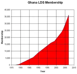 In 2018, the LDS Church reported having 78,065 members, along with 4 missions, 51 family history centers, and 303 congregations in Ghana.[22]
