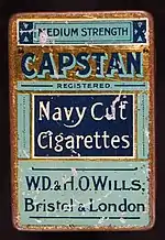 Capstan was originally launched by W.D. & H.O. Wills in 1894, and was one of the most popular brands of cigarettes in the early-twentieth century.[1] W.D. & H.O. Wills spent £4,000 (equivalent to £477,509.50 in 2018) on promoting the Capstan cigarettes in 1900, and these amounts were in addition to regular charges for advertising, including showcards and newspaper advertisements.[2] It was W.D. & H.O. Wills' answer to Player's Medium cigarettes.[3] In 1973, the UK Government published a table of the tar and nicotine contents of cigarettes available in the UK market, and Capstan Full Strength contained, by a margin of 0.21 mg/cigarette, the highest nicotine content (3.39 mg/cigarette) of any brand, and the second-highest tar content.[4][5] However, since 2004 cigarettes sold in the UK have had a cap of 10 mg of tar and 1 mg of nicotine per cigarette.