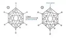- ↑ Note that the image the acidic proton is not the one bonded to the carborane but that it is the counterion not displayed.