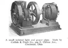 In 1893 or 1894 (sources differ), Carlisle and Finch purchased the shop from General Electric, intending to continue the repair business and branch out into manufacturing.[1][2][3] The new company was incorporated on April 17, 1897, with Carlisle serving as president.[1][4] The same year, they introduced their first new products, a searchlight based on the carbon arc principle, and a toy train, which also used a carbon arc for its headlight.[5] As the company grew, they added gasoline engines.[1][6][7]