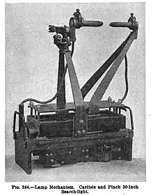 The earliest models used a carbon arc for the light source. Other companies had previously built carbon arc searchlights, but Carlisle & Finch added the innovation of mounting the carbon electrodes horizontally on the beam axis. The tip of the positive carbon faced the reflector, maximizing the amount of light reflected, and spacing of the carbons was adjusted by motorized screw-feed mechanisms.[15] A manually-activated screw moved the entire mechanism forward and backward, positioning the arc at the mirror's focal point. A pair of carbons had a lifetime of about seven hours.[16]
