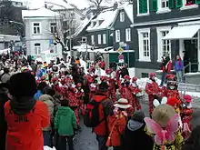 The aim of the associations is the maintenance of traditional carnival customs, and is recognized as non-profit in Germany.[2][3] In Rhineland, the committee that organizes the events in each town consists of a president and 10 junior members and is called the "Council of Eleven" or Elferrat. The number eleven, elf in German, is significant in Carneval celebrations because it is an acronym for the French Revolution values of egalité, liberté, fraternité.[4]
