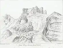 Ownership of the castle passed to the Vaughan and Cawdor families, and from the 18th century it started to attract artists. J. M. W. Turner painted the castle in 1798.[10] The second Earl Cawdor began an extensive renovation in the 19th century, and in 1932 Carreg Cennen was given to the guardianship of the Office of Works. In the 1960s Carreg Cennen Castle was acquired by the Morris family of Castell Farm, when Lord Cawdor's legal team made a mistake in the wording of the deeds and included the castle as part of the farm. Today, the castle remains privately owned by Margaret and Bernard Llewellyn, daughter and son in law of the late Mr. Gwilim Morris. The castle is now maintained by Cadw.[11] It is open daily from 9.30am to 5.00pm between April and October and 9.30 to 4.30pm between November and March (closed Christmas Day).[12]