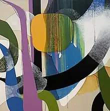 Carrie Moyer, born in Detroit, Michigan in 1960, received a BFA from Pratt Institute in 1985, an MA in Computer Graphics from New York Institute of Technology and an MFA from the Milton Avery Graduate School of the Arts at Bard College in 2001.[1][2] Moyer studied modern dance until she was in a serious car accident that forced her to shelve dancing and focus on painting. She still incorporates dance and movement in her art.[3] In 1995 she was a student at the Skowhegan School of Painting and Sculpture. Moyer has been awarded numerous grants, awards and residencies including a Joan Mitchell Foundation Painters and Sculptors Grant and an Anonymous Was A Woman Award (both 2009), Creative Capital Award (2000), Elaine de Kooning Memorial Fellowship (1999), Peter Norton Family Foundation Project Grant (1999) and the National Studio Program at PS1/Institute for Contemporary Art, New York, NY (1996). She is a Professor and serves as the Director of MFA Program in Studio Art at Hunter College. Moyer was represented by CANADA Gallery in New York City from 2003 until 2015; she is now represented by DC Moore Gallery.[4]