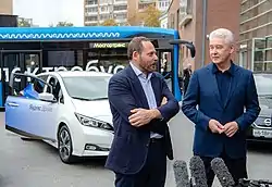 In the photo, the mayor of Moscow Sergey Sobyanin (on the right) and the head of Yandex Arkady Volozh participate in an event dedicated to the launch of Yandex.Drive's electric vehicles in late September 2019.[2]