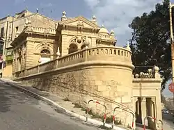 In 1886, a group of noblemen from Mdina commissioned the British architect Webster Paulson to design a clubhouse which was to be built on Saqqajja Hill.[1][2][3] The proposed design was submitted by October 1886, and the building was completed sometime before August 1888. Paulson died on 16 August 1887, while the building was still under construction, making the Casino Notabile his last work. The clubhouse was constructed on the site of a belvedere,[3] and it overlooks a wash house which was built in the late 18th century.[4][5] Due to its location on the crest of a plateau, overlooking an unobstructed view, it was also known as Point de Vue.[2]