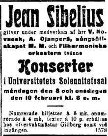 In early 1904, Sibelius labored on his first concertante work, the Violin Concerto in D minor, the premiere of which he had promised, in autumn 1903, to the German violinist Willy Burmester.[4] However, Sibelius—who needed cash in order to fund the construction of his new home, Ainola—opted to premiere the concerto at a concert of his works set for 8 February, even though Burmester was unavailable. (The concerto instead was given by the "far less distinguished player", Viktor Nováček (violin), a young violin teacher based in Helsinki.[5] To fill out the program, Sibelius hastily composed Cassazione a few weeks prior to the concert. Also on the program was The Origin of Fire (Tulen synty, Op. 32), a cantata for tenor, male choir, and orchestra that had premiered in 1902, as well as a third novelty, the choral song for male choir and orchestra, Have Your Courage? (Har du mod?, Op. 31/2). Sibelius conducted the Helsinki Philharmonic Society in all four pieces. The concert was repeated on 10 and 14 February.[5]