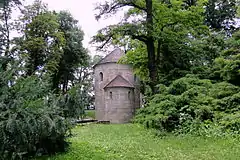 A decision to rebuild Castle Hill was taken after the defensive stronghold constructed on it was destroyed during the Thirty Years' War. There are only a few historical sources that inform us about development of the grounds around the castle and allocating them for green areas. A development plan from 1836 indicates that at the upper castle there was a garden of irregular shape with a small square in the centre and four paths going outwards. Between the former upper and lower castle, there was a second garden shaped as an irregular polygon.[1] In 1837 Carl Habsburg ordered the blowing up of the remains of the upper castle and the building of a castle in the Classicist style on the ruins of the lower castle. The new building was a summer residence of the Habsburg called the Hunting Palace of the Habsburg. The park at Castle Hill was designed by Joseph Kornhäusel, the court architect of the Viennese court. In 1914 in the north-west part of the hill artificial ruins were erected to emphasize the romantic nature of the park. Among the trees which grow on in the park on Castle Hill, eight are monuments of nature.[1][2][3]