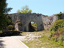 An interior courtyard, also ovular, encircled the old town, creating a second defensive perimeter, while in the east and south, the granite cliffs completed the defensive lines.[1] Here there are visible remains of homes and cubical-spaces, some with barbicans. This defensive zone is served by Fonte Vedra Gate to the south (a Roman arch doorway), while in the east is the principal entrance with access to Lavandeira, referred to as the Porta da Vila Gate.[1] To the west are the São João and the São Francisco Gates, with their own stone roads that converge at the town centre.