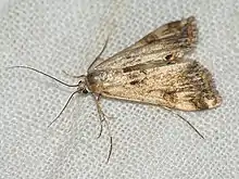 Adults of the species are sexually dimorphic.[3] The wingspan is 18–19 mm for males and 22–24 mm for females. The forewings are white. The costa, discal spot and a series of terminal spots are all fuscous. The hindwings are white with scattered pale fuscous scales.[4] Meyrick describes it- The forewings in male are whitish, with a yellowish-fuscous discal dot, traces of lines, and a pale brownish terminal streak; in female pale brownish, ochreous-mixed, with a darker discal spot, lines very indistinct, whitish, darker-edged, a whitish siibterminal streak. Hindwings are white; a dark fuscous discal dot; lines outlined with fuscous, sometimes nearly obsolete, first preceded by a yellow or fuscous spot in disc; subterminal and terminal ochreous lines enclosing a black fascia marked with four bluish-silvery dots. The larva is dark green or blackish; dorsal line black; head pale brown.[5]