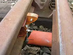 In some cases, catch points and trap points direct vehicles into a sand drag or safety siding, also sometimes called an arrestor bed. This may be a siding simply leading to a mound of sand, gravel or other granular material, or a siding where the rails are within sand-filled troughs.[1] This method of stopping a vehicle travelling at speed is preferred over a buffer stop as there is less shock to the vehicle involved.[2]