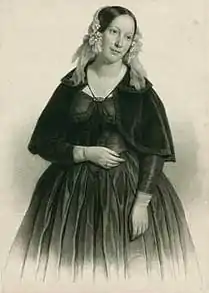 She was given her first singing role at the Royal Theatre when she was just 14, where she played the part of a young bride in Marie. She a strong, rich soprano voice, and was confident when on stage. She was signed on at the opera in 1834 and given a repertoire. The same year, she married the violinist Hans Sophus Simonsen after which her career was inhibited as she gave birth to several children. She was forced to retire prematurely in 1836 but returned the following year, encouraged by her audiences.[3] In the 1840s, as Italian opera became increasingly popular, she excelled in works by Donizetti, Bellini, Rossini and Verdi.[2] Simonsen last performed in November 1848 when only 32, in the role of Donna Anna in Don Giovanni. A few months later, in May 1849, she died while delivering yet another child. Among her eight children were the opera singer Niels Juel Simonsen and Fanny Simonsen, mother of the singer Erik Schmedes and the composer Hakon Schmedes.[1][2]