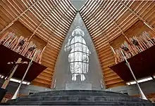 The worship space in The Cathedral of Christ the Light is a vesica piscis shape (translated into English means fish bladder), the shape formed by the intersection of two circles. The walls are composed of overlapping panels of wood and glass rising skyward to form the vault, much like the scales of a fish. The design is inspired by the miracle of the loaves and the fishes in Christian tradition, among other motifs.[1] The Oakland Tribune wrote of the Hartman's description of light, "The design allows light to filter in, reminiscent of how light filters through a canopy of tall redwood trees in a wooded glade, Hartman said".[1] The 58 feet high omega window contains a three-dimensional depiction of Jesus Christ, created with holes pierced into the window's aluminum panels, based on a 12th-century tympanum sculpture on the Royal Portal of Chartres Cathedral.[12]